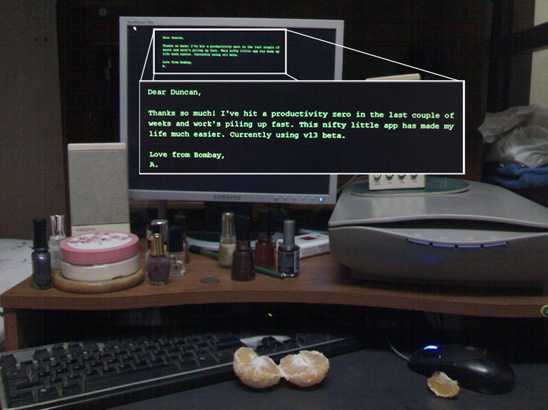Since the first release in early July 2006, I’ve received many emails requesting new features for JDarkRoom. From reading most of the comments on blogs and in the podcasts, I should take the time to point out that JDarkRoom is first and foremost intended as a creative writer’s tool - to get ideas down and to focus on the words themselves, rather than font style, font size, paragraph formatting etc. That said, it is a text editor and people have therefore requested features such as spellcheck, page formatting, syntax highlighting and editing of documents held on the internet. However, other editors already do these things well, so I won’t be adding these features to JDarkRoom any time soon. (I’d rather that it set out towards a relatively simple goal and succeeded than tried to do too much.)