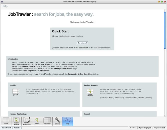 The initial help screen, as seen when JobTrawler first starts.