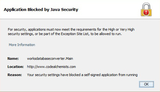 Solution You have two options - either change the security level for Java applications, or if you prefer not to do this, download Works Database Converter and run it directly on your system - see "Run Works Database Converter from the Command Line", below. Change security level
