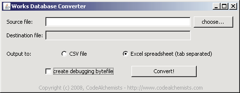 This application converts old Microsoft Works Database (*.wdb) files (e.g. MS Works 3 and 4) into a spreadsheet compatible with all versions of Microsoft Excel. The data extraction is done on a 'best-effort' basis, which works reasonably well provided that you only have one table of data per file that you process. The best solution is always to load up the database into an old copy of Microsoft Works and then export as CSV, or some other file format readable by Excel or Access. However, in the event that you only have the database file, this application may help. Requirement: You need Java installed on your computer for this application to work. You can check whether you already have Java via this page. Donation-ware Works Database Converter is free, but supported entirely by donations. If you find it useful please consider making a donation below (even a few €/$/£ help to keep this website running). (paypal account not required)